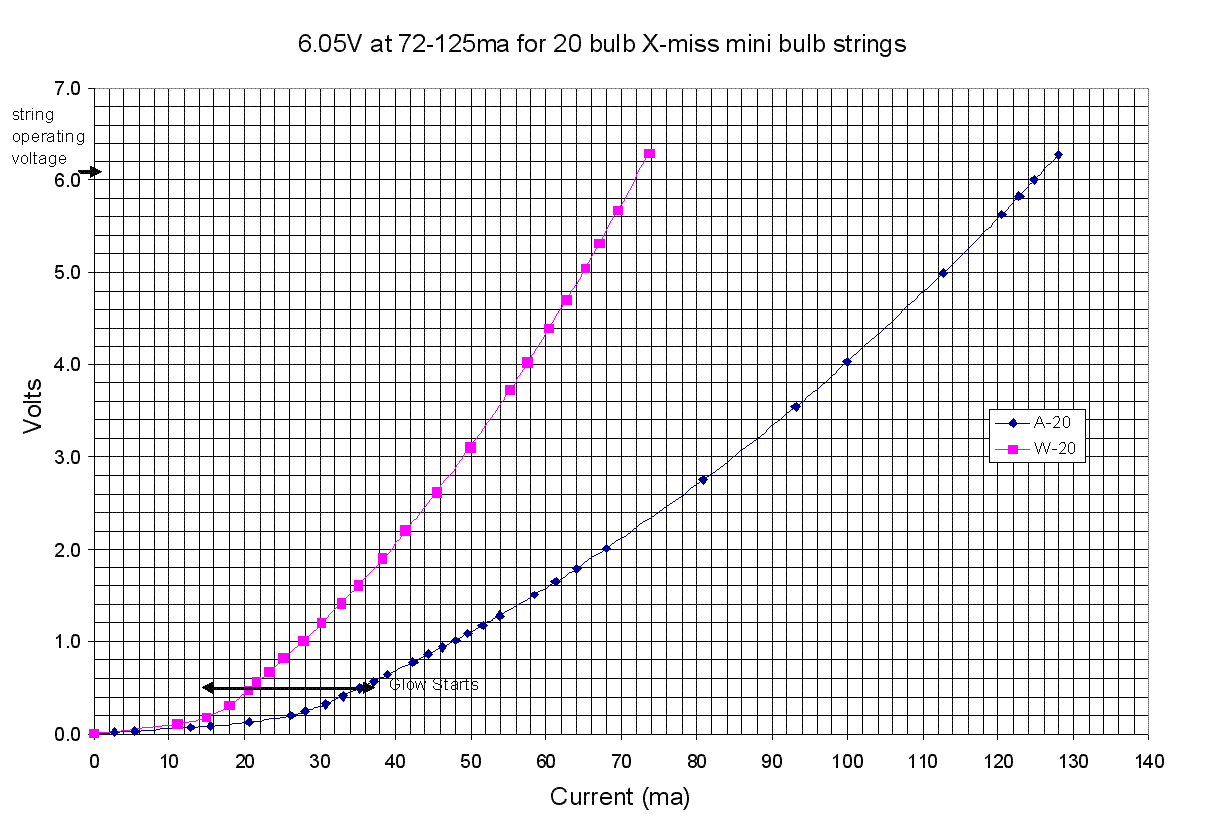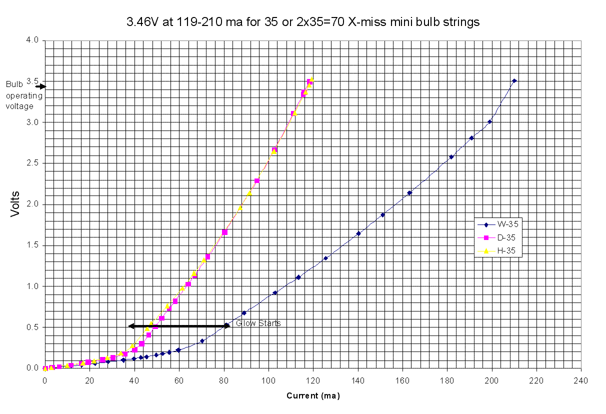 The following graphs show the typical curves for voltage and current for miniature x-mass tree bulbs.