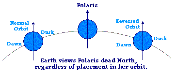 For Eugene, OR Orion would be expected to be a SE constellation for a stalled orbit, but a SW constellation for a normal orbit. For an Earth in a Dec 1 position, at 8:00 PM 95° (East) rising, moving to 140° (SSE) and 37° up by 11:00 PM. For an Earth in a Feb 23 position, at 8:00 PM found at 195° (SSW) and 43° up, moving to 240° (SW) and 25° up by 11:00 PM. For Orion to be too far West is the reverse of what is expected for a stalled or reversed orbit, but the Zetas explain that a combined Tilt and Lean causes what the viewer assumes to be West to be what is in fact NW and the assumed SSE rising of a Dec 1 position thus to be viewed as SSW. By the Earth tilting in toward the Sun, Orion is thus viewed in the evening as being too far South.
