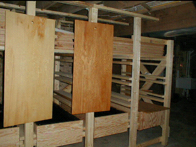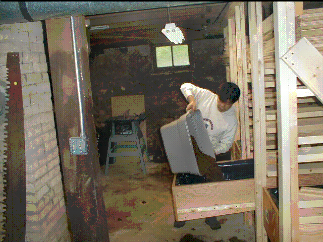 The worm beds slide (below) out for maintenance (next below). The rack is attached to the basement beams for support. The table saw purchased for the worm bed project can be seed in the background, and the new electrical infrastructure in support of the basement lab at left and top. Bed tops (last below) are placed over the beds to keep them moist and prevent the active worms from crawling out.